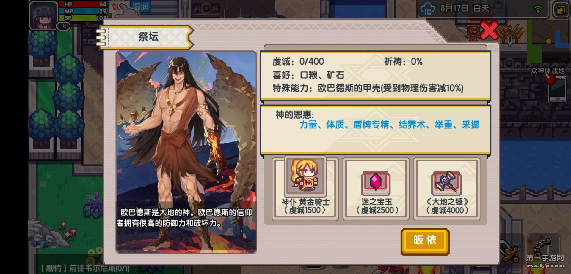 伊洛纳信仰大地之神欧巴德斯好处有什么?相信是很多玩家都想周到的问题,毕竟这个神的神坛离玩家的距离最近,那么下面就让小编带大家一起去看看信仰大地之神的好处有哪些吧。大地之神欧巴德斯大地之神欧巴德斯大地之神介绍欧巴德斯是大地的神。欧巴德斯的信仰者拥有很高的防御力和
