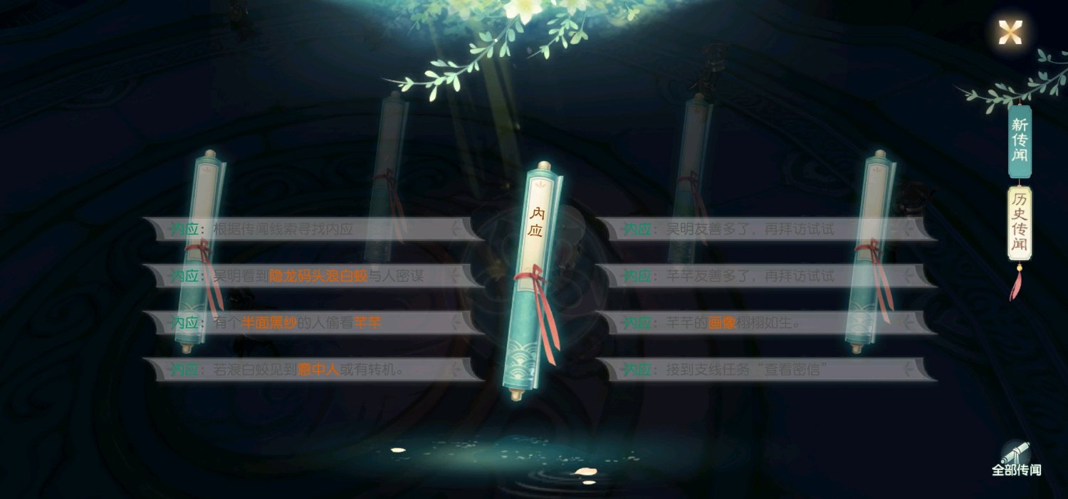 花与剑手游中有许多的传闻任务,有许多的小伙伴们都在吐槽传闻任务比较难,不知道怎么做传闻任务,那么接下来小编就给大家带来了手游中内应传闻任务的攻略。一起来看看吧内应传闻任务攻略1:根据传闻线索寻找内应2:吴明看到隐龙码头浪白蛟与人密谋3:有个半面黑纱的人偷看芊芊4:若