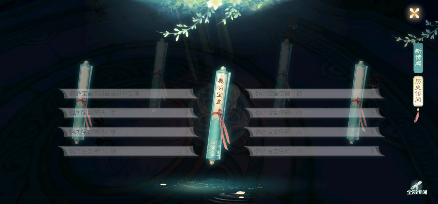 花与剑手游中有许多的传闻任务,有许多的小伙伴们都在吐槽传闻任务比较难,不知道怎么做传闻任务,那么接下来小编就给大家带来了手游中吴明宝盒传闻任务的攻略。一起来看看吧集齐宝盒密码前去打开宝箱【1/7】宝盒密码:还【2/7】宝盒密码:梦【3/7】宝盒密码:谷【4/7】宝盒