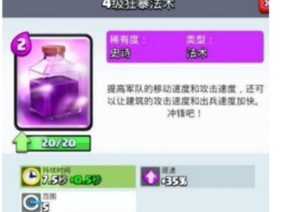 皇室战争狂暴法术卡牌好用么?在皇室战争中不同的卡牌组合的效果也是不同,可能有些玩家对皇室战争狂暴法术卡牌不是很清楚,下面就跟着小编一起来看看吧。1.基本信息(将以图片的形式展示卡牌模样及属性) 狂暴法术费用:2提速(攻速+移速):35%持续时间:6/6.5/7