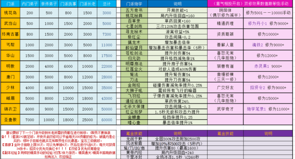 暴走大侠中大家都知道门派有贡献值,但是应该还不清楚各个门派到底需要多少贡献值吧,下面小编就为大家找来了一张图表,相信可以让大家很清楚的了解具体数据,建议收藏保存哦。暴走大侠门派贡献表友情提示-内功很重要武器装备也不能少-走位很重要千万不要原地发呆-勇闯桃花岛要