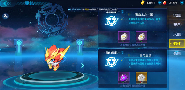 奥拉星手游圣王麒麟特性怎么选择?在手游中,合适的特性选择能够让亚比的战斗力大大提升。下面小编就为大家带来手游圣王麒麟特性推荐,一起来看看吧。圣王麒麟特性推荐1:系别特性:吸血之力能力特性:雷电王谕、闪电王谕这套特性非常适合PVP使用,雷电王谕、闪电王谕可以说是当前版