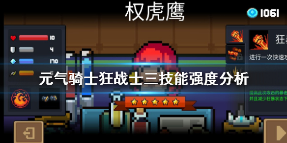 元气骑士狂战士三技能厉害吗?元气骑士迎来了全新的暑假版本,增加了很多的新内容,其中部分角色开放了三技能,狂战士就是其中之一,那么狂战士三技能厉害吗,下面小编给大家分析一下强度,一起来看看吧。元气骑士狂战士三技能强度分析一、基础数值通过基础数值我们可以发现狂战士血多、盾少并且还很缺蓝(现在被动技能改一下,确实增加了他的伤害,但是耗蓝程度还是和伤害成正比),算是比较脆的角色控蓝也是非常重要的。二、技能