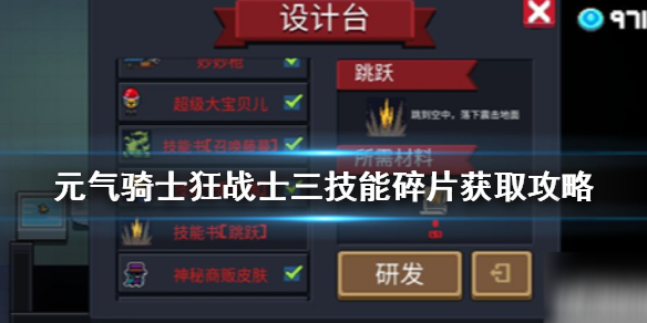 元气骑士狂战士三技能碎片怎么得?元气骑士迎来了全新的暑假版本,新增了很多新内容,其中部分角色开放了三技能,狂战士就是其中之一,那么狂战士三技能碎片怎么获取,下面小编来告诉大家,一起来看看吧。元气骑士狂战士三技能碎片获取攻略元气骑士狂战士三技能有两种获取途径,一种是花钱购买,另外一种就是用技能书残页跳跃合成,技能书残页跳跃可以击杀雪山大猿王的时候,有一定几率掉落,需要收集满8片后方可进行合成。以上就