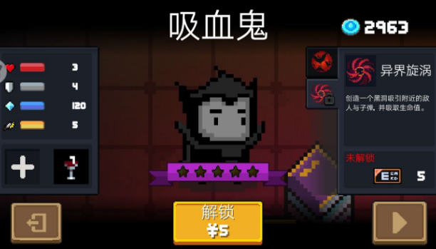 元气骑士吸血鬼异界漩涡怎么得?有很多小伙伴们都不知道,那么下面就由小编来为大家带来吸血鬼异界漩涡获得方法吧,希望能够帮助到大家。吸血鬼异界漩涡获得方法吸血鬼二技能,花费5元解锁,造成一个漩涡吸引敌人,类似黑洞导弹,伤害略低但是回血数量可观,可以反弹敌人子弹,导