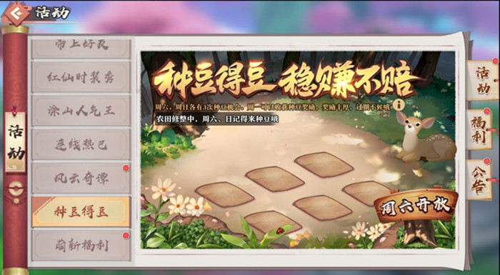 狐妖小红娘种豆得豆活动有哪些福利?想必很多的的小伙伴们都不是很清楚,那么接下来,就跟随游戏爱好者小编一起来看一下《狐妖小红娘种豆得豆活动详情及福利一览》吧!感兴趣的小伙伴一定不要错过哦!狐妖小红娘种豆得豆活动详情及福利一览想要获得更多强大的伙伴,不只要欧气上身,姻缘豆才是硬资本。周末种豆得豆活动再次上线,消耗铜钱,换取绑玉、姻缘豆,稳赚不赔,千万别错过~以上就是游戏爱好者小编为大家带来的《狐妖小红