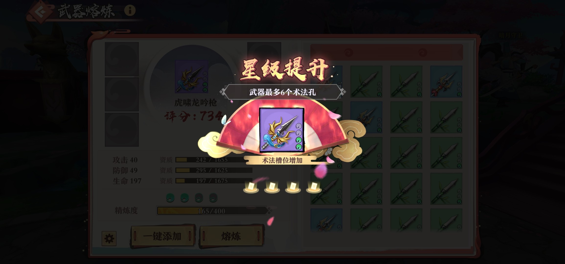 狐妖小红娘手游武器星级怎么提升?武器星级的提升就意味着术法槽孔的增加。不同品质的武器的上线星级不一样,术法槽孔的数量也不一样。下面小编就为玩家带来狐妖小红娘手游武器星级快速提升技巧,一起来看看吧。武器星级快速提升技巧武器星级怎么提升当精炼度满了之后,武器的星级
