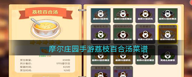 荔枝百合汤作为摩尔庄园手游中,玩家可以制作的食谱之一,那么具体应该怎么做呢?对此,游戏爱好者小编特意为大家准备了这边详细的内容攻略,让我们一起来看看吧。摩尔庄园手游荔枝百合汤菜谱制作菜谱:【荔枝百合汤】:荔枝*2、百合花*2、小麦*3【食材获取】:荔枝:农场主50级后购买荔枝种子,种植可获得;百合花:农场主42级后购买百合花种子,种植可获得;小麦:农场主32级后购买小麦种子,种植可获得。好了,今天
