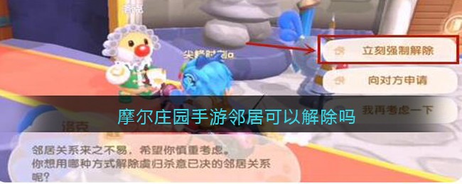在摩尔庄园的手游中邻居作为游戏玩法之一,那么我们应该怎么解除邻居关系呢?下面,就和游戏爱好者小编一起来看看关于这方面的详细内容攻略吧!摩尔庄园手游邻居可以解除吗解除方法:1、来到摩尔城堡,找到NPC洛克;2、选择【解除邻居】这一项;3、选择【立刻强制解除】选项;4、强制解除需要【1000摩尔豆】的手续费,支付费用后即可成功解除双方的邻居关系。5、如果你不想花费摩尔豆解除双方的关系,可以向对方申请解