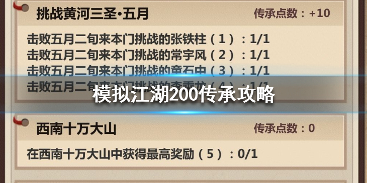 模拟江湖是一个爆火的模拟游戏,在游戏中传承是非常重要的,高级别的传承能为玩家带来极大的收益,这个游戏最高的传承是200点,你知道200点传承如何获取吗?下面就让游戏爱好者为大家介绍一下模拟江湖200点传承获取方法吧~模拟江湖200传承怎么打1.传承100,矿洞必选,力士和三才选一个,选三才是为了打的过晚上的狼人,新手村的目标是攒钱,这种开局加上已经熟悉的新手村操作应该稳过不细讲,平四刀刷一刷也会有