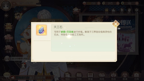 在中天工石是比较重要的一种材料,是我们后期建设我们的庄园的必备材料,因此很多玩家们都想知道这个材料哪里有的刷,下面就让小编为大家带来天工石获得方法。天工石获得方法1、异域探索:探索有5个地图,每个地图都会掉落天工石奖励,建议大家每天都要不停的探索来获取大量天工