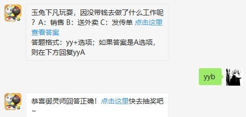《一起来捉妖》玉兔下凡玩耍,因没带钱去做了什么工作呢?这是一起来捉妖9月6日微信每日一题,接下来就由小编带来一起来捉妖9月6日微信每日一题答案,快进来看一看吧。2019一起来捉妖9月6日微信每日一题问题 玉兔下凡玩耍,因没带钱去做了什么工作呢?A:销售 B:送
