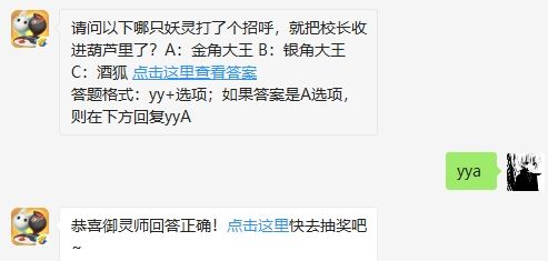 《一起来捉妖》请问以下哪只妖灵打了个招呼就把校长收进葫芦里?还有不知道答案的,接下来就由小编带来一起来捉妖9月3日每日一题答案,快进来看一看吧。2019一起来捉妖9月3日微信每日一题问题 请问以下哪只妖灵打了个招呼,就把校长收进葫芦里了? A:金角大王 B:银