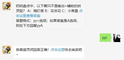 《一起来捉妖》奶妈盘点中以下哪只不是输出辅助的妖灵呢?还有不知道答案的小伙伴们接下来就由小编带来一起来捉妖9月4日每日一题答案,快进来看一看吧。2019一起来捉妖9月4日微信每日一题问题 奶妈盘点中,以下哪只不是输出+辅助的妖灵呢? A:海灯使 B:花非花 C