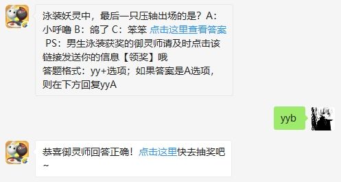 《一起来捉妖》泳装妖灵中最后一只压轴出场的是?有很多小伙伴们不知道答案的,接下来就由小编带来一起来捉妖9月5日每日一题答案,快进来看一看吧。2019一起来捉妖9月5日微信每日一题问题 泳装妖灵中,最后一只压轴出场的是? A:小呼噜 B:鸽了 C:笨笨答题格式: