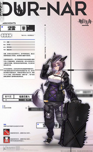在明日方舟手游中新增干员坚雷的怎么样呢?想必很多小伙伴们都还不知道坚雷的背景故事?接下来就让小编来为大家讲解下新增干员坚雷背景故事介绍吧,赶紧来看看吧。新增干员坚雷背景故事:坚雷,前哥伦比亚正规军中士,因不明原因退伍。通过正规录用渠道加入罗德岛,担任教官与重装干员职务