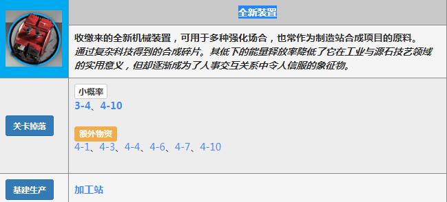 明日方舟全新装置如何获得?有很多小伙伴们都不知道,那么下面就由小编来为大家带来全新装置获得方法吧,希望能够帮助到大家。全新装置获得方法从上图中我们可以看到,全新装置在3-4和4-10这两个关卡都有小概率会掉落,此外通过加工站也可以用装置进行合成。3-4和4-1