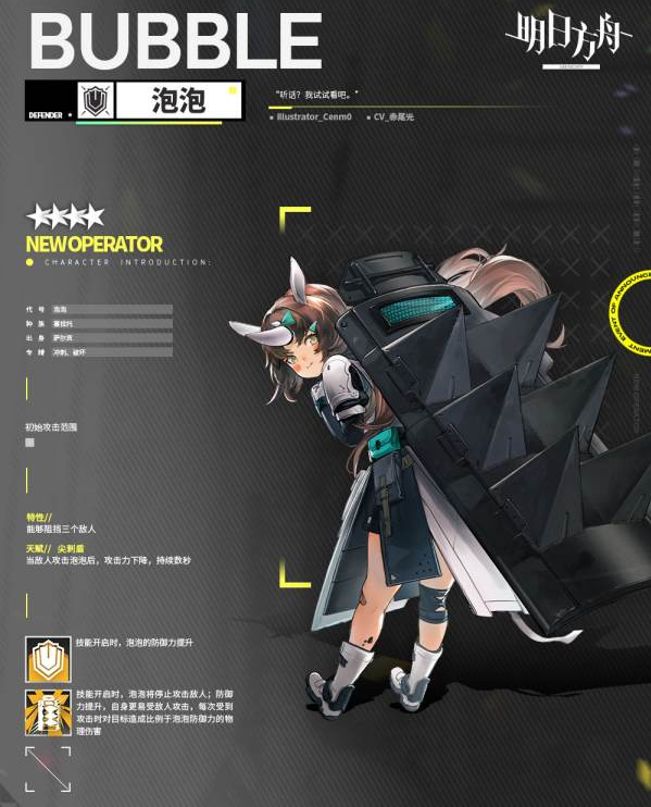 明日方舟重装干员泡泡怎么样,泡泡作为萨尔贡某位部族勇士的女儿。在泡泡来到罗德岛之前,相关干员已经与其父亲进行了接洽。据了解,泡泡是在野外游玩时直接接触源石致伤,那么这名角色有着什么样的技能设定呢?关于这个小编已经帮大家准备好了相关内容,希望可以帮助到大家,快来和小编一起来看看吧。明日方舟泡泡技能属性介绍一、干员介绍[新增干员]//泡泡“你就是训练营的 大哥 老大吗,你叫博士吗?嗯......但你