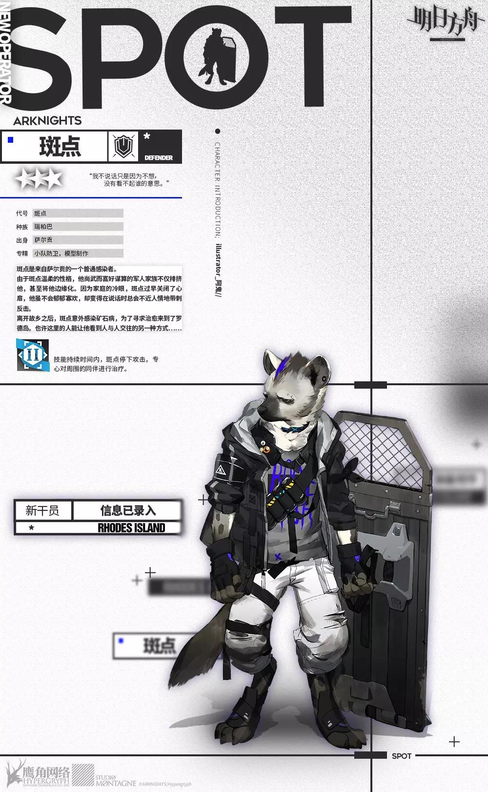 明日方舟装干员斑点怎么样,斑点在离开故乡之后,意外的感染矿石病,为了寻求治愈来到了罗德岛。那么这样的一位干员有着怎么样的属性技能呢?相信还有很多小伙伴不清楚,对此游戏爱好者小编特地为大家准备了相关的详细内容,让我们一起来看看吧!干员斑点介绍【新加入干员】斑点 活动赠送你好,我是隶属行动预备组A6的斑点,职责大概是保护预备组每天都在闹腾的另外几个家伙。斑点是来自萨尔贡的一个普通感染者。由于斑点温柔的