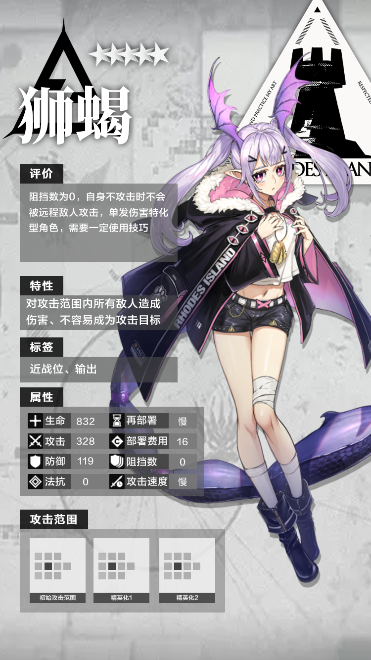 明日方舟特种干员狮蝎怎么样,狮蝎在潜伏、侵扰、突袭敌军阵线等行动中均表现出过硬的战斗技巧。现作为特种干员,为罗德岛提供特别行动服务。那么她有什么样的技能呢?关于这个小编已经帮大家准备好了相关内容,希望可以帮助到大家,快来和小编一起来看看吧。特种干员狮蝎评价天赋:初始天赋:隐匿的杀手初级不在攻击单位时会进入隐匿状态(不成为远程攻击的目标),攻击时打破隐匿并攻击力提升20%。在不攻击7s后,会再度进入