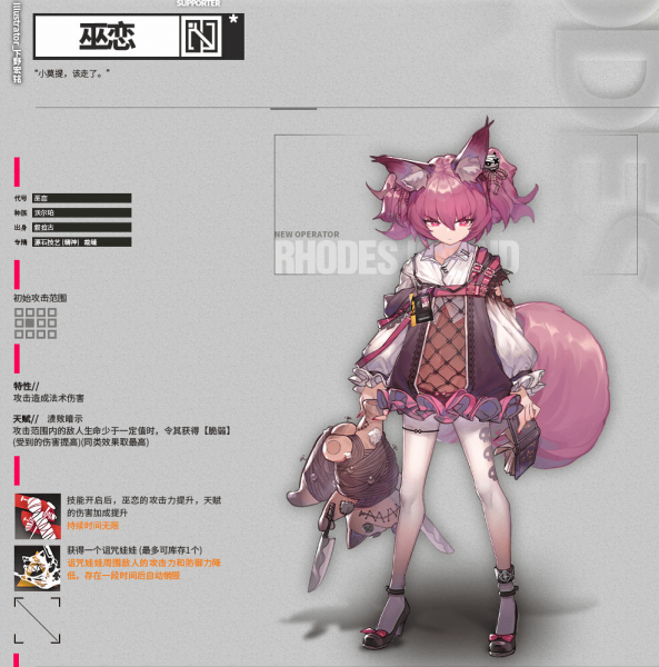 明日方舟辅助干员巫恋怎么样,巫恋在游戏中被很多玩家评价为最强的辅助干员,毕竟其特殊的技能设定可以说是不管什么样的角色都能给你扶起来,那么她的技能到底是怎么样呢?很多小伙伴对这方面的内容还不是很了解,为此,小编特地为大家整理了这些内容,一起往下看看吧!明日方舟干员巫恋玩法攻略基础数据面板(精二满级)生命1728、攻击408(满信赖+65)、防御105、法抗25部署费用10-12、阻挡数1、攻击间隔2