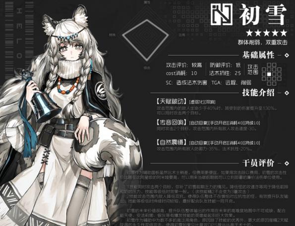 明日方舟辅助干员初雪怎么样,谢拉格出身,喀兰圣女,全谢拉格的宗教领袖。运用神赐的圣铃,呼唤风雪的力量。那么她有怎么样的技能设定呢?关于这个小编已经帮大家准备好了相关内容,希望可以帮助到大家,快来和小编一起来看看吧。明日方舟干员初雪评价【背景介绍】初雪是谢拉格圣山的喀兰圣女,是谢拉格宗教领袖,拥有者一系列的特权,即便是她的哥哥谢拉格名义上的最高长官银灰,见到她时也必须合掌行礼。成为圣女和成为圣女后的