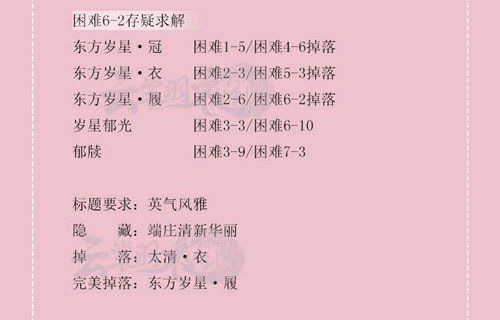 云裳羽衣第六章困难完美通关攻略是小编为您推荐的云裳羽衣相关文章,喜欢的朋友快来看看把,本篇文章小编将给大家带来的是云裳羽衣第六章困难完美通关攻略,下面就和小编一起来看看吧!困难6-2存疑求解搭配方案:东方岁星冠困难1-5/困难4-6掉落东方岁星衣困难2-3/困