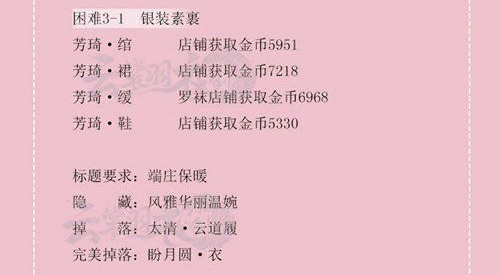 小编为您介绍云裳羽衣第三章困难完美通关攻略,这里有更多云裳羽衣游戏攻略详尽的介绍,本篇文章小编将给大家带来的是云裳羽衣第三章困难完美通关攻略,下面就和小编一起来看看吧!困难3-1银装素裹搭配指南:芳琦绾店铺获取金币5951芳琦,裙店铺获取金币7218芳琦缓罗袜