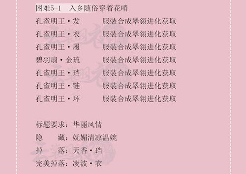 小编为您介绍云裳羽衣第五章困难完美通关攻略,这里有更多云裳羽衣第五章游戏攻略详尽的介绍,本篇文章小编将给大家带来的是云裳羽衣第五章困难完美通关攻略,下面就和小编一起来看看吧!困难5-1入乡随俗穿着花哨搭配指南:孔雀明王发服装合成翠翎进化获取孔雀明王衣服装合成翠