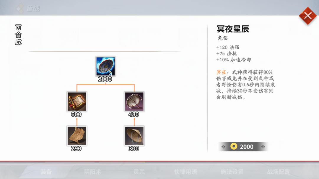 冥夜星辰作为决战平安京中一件比较冷门的装备,那么它具体适合哪些式神呢?很多小伙伴对这方面的内容还不是很了解,为此,小编特地为大家整理了这些内容,一起往下看看吧!决战平安京冥夜星辰怎么样一、装备介绍1.合成路径【冥夜星辰】售价2000金币,中规中矩的价格,合成路径为一本古事记之卷和一把通灵罗伞。同时,最终合成需要920金币,会造成比较长时间的真空期,这也是决定它不属于前中期装备的因素之一。2.装备基