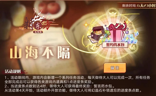 中的山海不隔活动想必小伙伴们都已经在参加了吧!那么具体我们应该怎么玩呢?下面就一起来看一下小编为大家带来的山海不隔活动攻略吧!活动攻略时间:10.10-10.16,7天消耗:无(完成日常就好)奖励:若干游戏道具+誓约墨水Tips1. 完成日常任务就好,很简单2