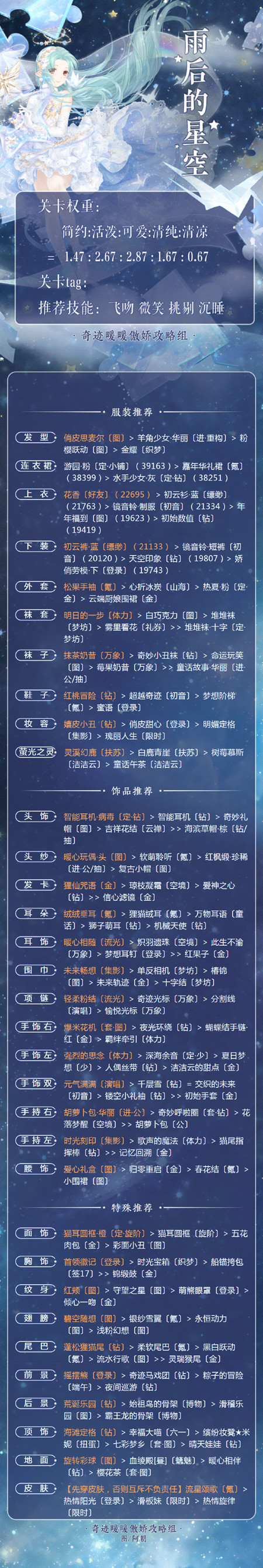 星河幻梦活动关卡中的雨后的星空要怎么搭配才能获得高分评价呢?想必很多小伙伴们都不是很清楚,接下来就让小编来带着大家一起来看一下吧,希望大家会喜欢。雨后星空高分搭配攻略关卡权重:简约:活泼:可爱:清纯:清凉=1.47: 2.67: 2.87: 1.67: 0.6