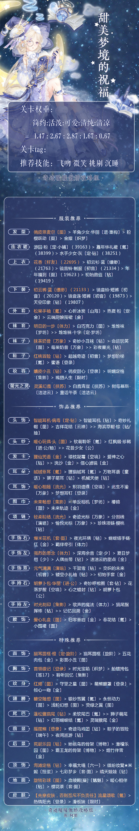 甜美梦境的祝福怎么搭配得高分?这是星河幻梦活动中的挑战关卡之一,小编这里带来了甜美梦境的祝福高分搭配攻略,想要参考的玩家们就来看看吧!甜美梦境的祝福高分搭配攻略关卡权重:简约:活泼:可爱:清纯:清凉=1.47: 2.67: 2.87 : 1.67: 0.67关