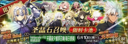 5月27日FGO国服维护之后将同活动一同开启新卡池「Fate/Apocrypha FGO 特别活动开幕前夕推荐召唤(每日替换)」。本次卡池分为黑之阵容/红之阵营推荐召唤两部分。接下来小编就带大家一起来看一看其中红之阵营推荐召唤的卡池内容介绍,以及其中的UP角