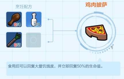 乐高无限鸡肉披萨怎么做?有很多小伙伴们都不知道,那么下面就由小编来为大家带来鸡肉披萨制作方法吧,希望能够帮助到大家。鸡肉披萨制作方法食物介绍:食用后可回复饥饿度,并立即回复50%的生命值。制作方法:消耗烤鸡*4+满罐牛奶*1+甘蔗*2在烹饪台合成制作食物效果: