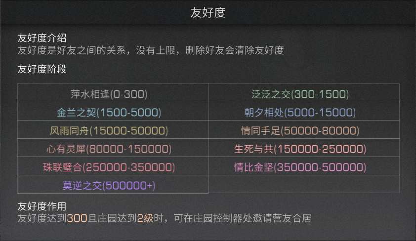 戒指作为明日之后在近期更新后上线的一个特殊装备,能够通过玩家的友好度来提升自身的加成属性,那么有哪些途径可以快速提升友好度呢?关于这个小编已经帮大家准备好了相关内容,希望可以帮助到大家,快来和小编一起来看看吧。明日之后友好度怎么快速提升一、友好度介绍由于友好度限制,同居友好度必须达到15000以上才可获得戒指从而享受加成,想要提升戒指等级则需要提升相应的友好度。下图是游戏内的友好度介绍,包含了友好