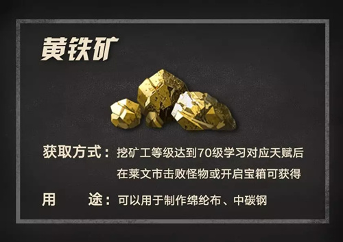 《明日之后》中的黄铁矿我们应该如何获取呢?很多小伙伴还不是很了解。那么接下来,就跟随小编一起来看一下具体的获取攻略介绍吧!获取攻略挖矿工等级达到70级学习对应天赋后在莱文市击败怪物或开启宝箱可获得用途:可以用于制作纶布、中碳钢以上就是游戏爱好者小编为您带来的全部内容,更多资讯关注游戏爱好者。明日之后相关攻略推荐:明日之后水晶虾饺如何制作?水晶虾饺制作配方一览明日之后新模式火力全开怎么玩-新训练模式