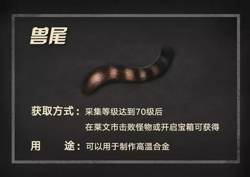 《明日之后》中的兽尾应该如何获取呢?很多小伙伴还不是很了解。那么接下来,就跟随小编一起来看一下具体的获取攻略介绍,感兴趣的小伙伴一定不要错过哦!获取攻略采集等级达到70级后在莱文市击败怪物或开启宝箱可获得用途:可以用于制作高温合金以上就是游戏爱好者小编为您带来的全部内容,更多资讯关注游戏爱好者。明日之后相关攻略推荐:明日之后水晶虾饺如何制作?水晶虾饺制作配方一览明日之后怎么制作干蒸-干蒸材料食谱制