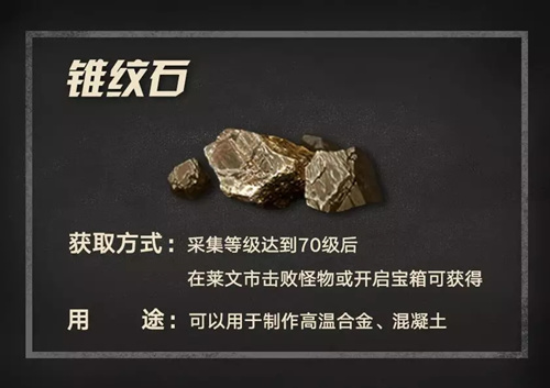 《明日之后》中的锥纹石我们应该如何获取呢?很多小伙伴还不是很了解。那么接下来,就跟随小编一起来看一下具体的获取攻略介绍吧!获取攻略采集等级达到70级后在菜文市击败怪物或开启宝箱可获得用途:可以用于制作高温合金、混凝土以上就是游戏爱好者小编为您带来的全部内容,更多资讯关注游戏爱好者。明日之后相关攻略推荐:明日之后学园智造怎么购买? 学园智造时装购买性价比分析明日之后怎么制作咸蛋蒸肉饼-咸蛋蒸肉饼食谱