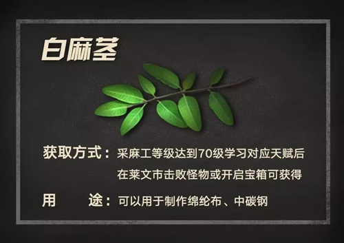 《明日之后》白麻茎应该如何获取呢?很多小伙伴对于这一资源的获取方法了解的还不是很清楚。那么接下来,就跟随小编一起来看一下具体的获取攻略介绍吧!获取攻略采麻工等级达到70级学习对应天赋后在莱文市击败怪物或开启宝箱可获得用途:可以用于制作绵纶布、中碳钢以上就是游戏爱好者小编为您带来的全部内容,更多资讯关注游戏爱好者。明日之后相关攻略推荐:明日之后新模式火力全开怎么玩-新训练模式火力全开游戏机制玩法介绍