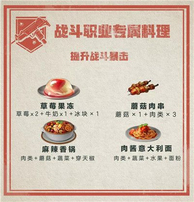 职业专属食谱有哪些?中有很多与职业息息相关的食物,大家若是能利用这些职业专属食物就能更好的提升自己的战力,下面小编为大家带来了职业专属食谱汇总,一起来看看吧。职业专属食谱一、战斗职业专属料理想要成为一名末世大佬怎么能不提高自己的战斗能力呢?别担心,盘了这些料理