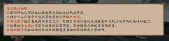 手游最近的荒川之战大家一定都在玩吧!那么其中的海之银沙我们应该怎么玩呢?很多小伙伴还不是很清楚。那么接下来,就跟随小编一起来看一下具体的玩法介绍吧!玩法介绍:海之银沙是富含荒川灵力的特殊道具,是御魂以外的另一种装备,可以增加我方式神属性并且赋予额外的技能效果。