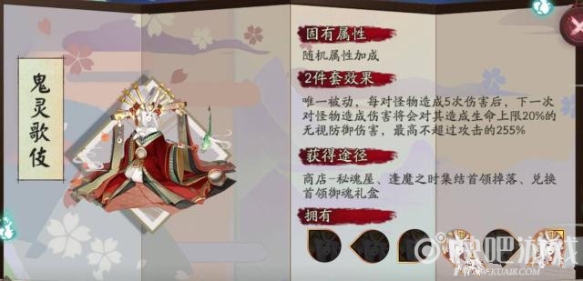 阴阳师鬼灵歌伎御魂是最新御魂,她在舞坊善于歌舞,很多玩家可能想知道阴阳师鬼灵歌伎御魂效果是什么,下面小编为大家带来介绍。《阴阳师》鬼灵歌伎御魂属性效果介绍 效果属性:唯一被动,每对怪物造成5次伤害后,下一次对怪物造成伤害时,将会对其造成生命上限20%的无视防御
