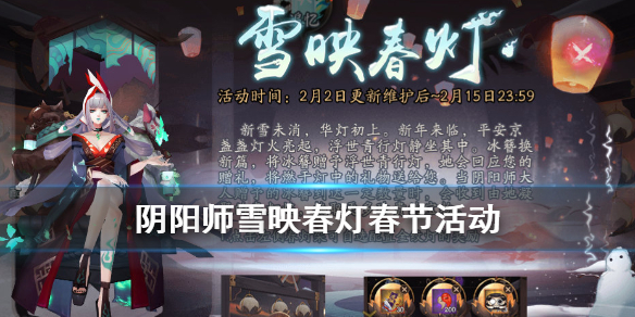 雪映春灯作为在2月2日更新后上线的春节活动之一,很多玩家对于活动的玩法奖励都不是很清楚,对此,不了解的小伙伴,那就快来看看小编给大家准备的相关游戏内容吧!阴阳师雪映春灯春节活动一、活动介绍冬雪未消,华灯初上。新年来临,平安京亮起盏盏灯火,浮世青行灯静坐其中。冰簪换新篇,将冰簪赠予浮世青行灯,她会回应您的赠礼,将燃于灯中的礼物送给您。当阴阳师大人赠予的冰簪到达一定数量时,会受到由她凝聚的春灯焰,换取