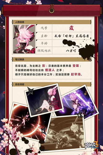 《崩坏3》霞的忍者笔记都有哪些具体内容呢?很多小伙伴还不是很了解。那么接下来,就跟随玩游戏网的小编一起来看一下具体的内容介绍吧!感兴趣的小伙伴一定不要错过哦!霞的忍者笔记内容一览:极东之地,八重町的夜幕下,代号为「霞」的忍者正在悄然展开行动……而在她贴身保存的笔记中,记录了哪些不为人知的秘闻呢?无论黑夜还是白昼,八重町的街头,常有一位白发的少女外出巡逻。时刻保持警惕的她,究竟在城中搜寻着谁的身影?
