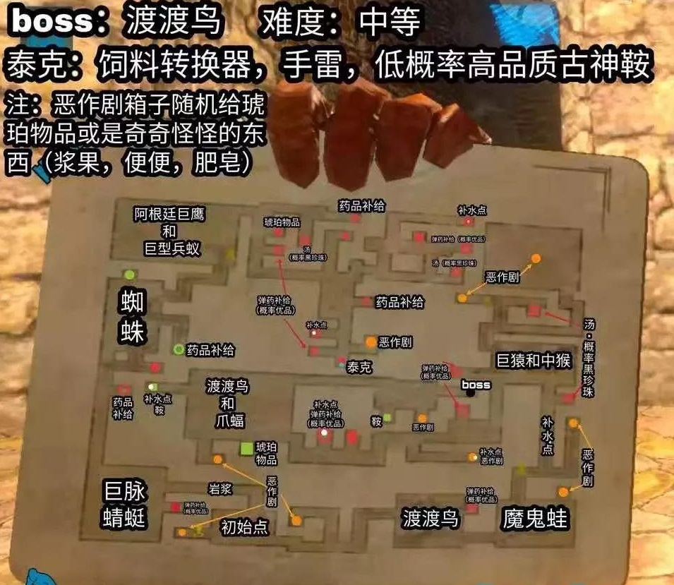 方舟生存进化万圣节的地下迷宫特别活动已经开启,新的渡渡鸟boss已经出现,那么大家知道这个boss该怎么打吗,下面小编就为大家详细解答一下。方舟生存进化万圣节渡渡鸟通关攻略出生点直接往左侧走就会遇到岩浆,第一个房间就是巨型蜻蜓,用刀或者长矛就可以轻松打死,过本