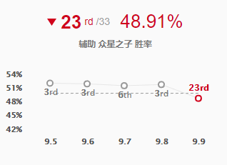 索拉卡在路人局强势了很久,最近几个版本的胜率和出场率一直排在极其靠前的位置。因此,设计师决定在本周的9.9版本中进行了削弱,这次削弱后的索拉卡,主E打法基本上玩不了,线上的消耗压制能力变弱了。从op.gg上的数据也可以看出,索拉卡的胜率已经从上个版本的第3名