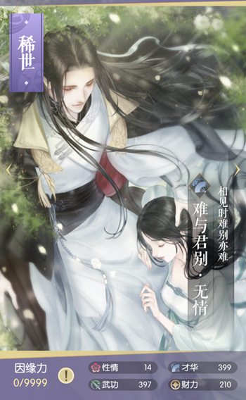 在遇见逆水寒里,无情角色的难与君别是武功和才华属性比较高的卡牌,相见时难别亦难,看上去十分感伤的一张卡牌,下面就为大家带来详细的攻略介绍,一起来看看吧!更多卡牌攻略请点击:遇见逆水寒攻略大全难与君别·无情攻略稀有度:稀世获得方法:结缘有几率获得卡牌属性:性情