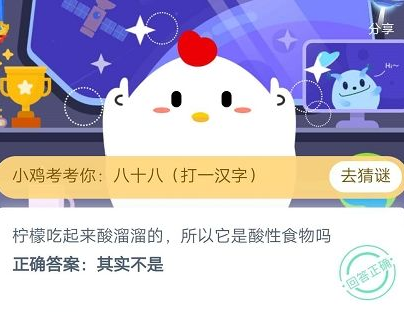 很多小伙伴在玩支付宝的蚂蚁庄园,每天的庄园答题可以获得180g饲料喂养小鸡,帮助小鸡下蛋,攒够5颗可以献爱心。所以6月15日的题目:柠檬吃起来酸溜溜的所以它是酸性食物吗?答案如下,希望可以帮助到大家。柠檬吃起来酸溜溜的所以它是酸性食物吗答案:其实不是答案解析:食物的酸碱性不是依靠口感来划分的,而是根据人体消化吸收之后,体内的代谢产物是酸性还是碱性来判断的。柠檬虽然吃起来酸酸的,但进入人体后,最终只