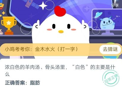 各位使用支付宝的同学们,参与答题答题正确可以拿到饲料,今天的题目,浓白色的羊肉汤骨头汤里白色的主要是什么?在这篇教程内小编就为各位介绍了蚂蚁庄园答题攻略,还不知道的朋友不要错过哦。浓白色的羊肉汤骨头汤里白色的主要是什么答案:脂肪答案解析:汤熬成浓白色,主要是脂肪的“功劳”:加热过程中,脂肪被乳化,形成稳定的脂肪小液滴悬在水中,汤就呈现出乳白色了,通常脂肪越多汤越白。所以常喝这种汤很容易长胖哦。蚂蚁